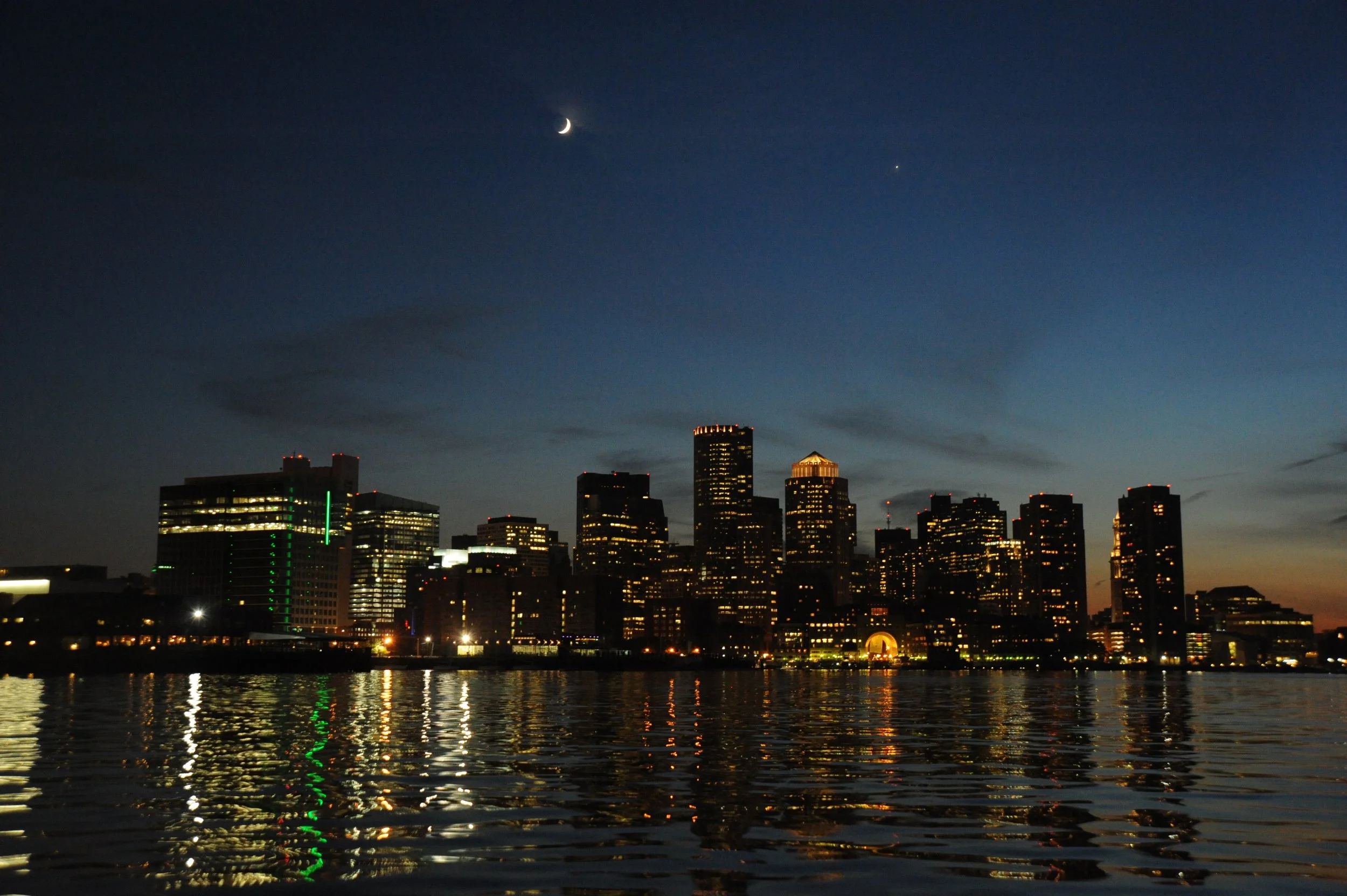 Enjoying a ride on a water taxi across the Boston Harbor .